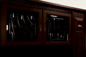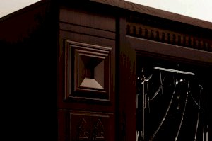 Корпус: ДСП, декоры: «дуб оксфорд» , патина Фасады: МДФ, зеркало с фацетом, прозрачное стекло с фацетом и гравировкой; декоративные вставки с фигурной фрезеровкой: МДФ в пленке ПВХ с эффектом патины