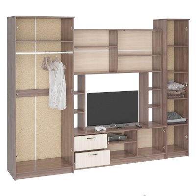 Многофункциональная и практичная гостиная выполнена в современном дизайне. Гостиная состоит из трёх модулей (шкаф платяной, шкаф бельевой, средняя секция)